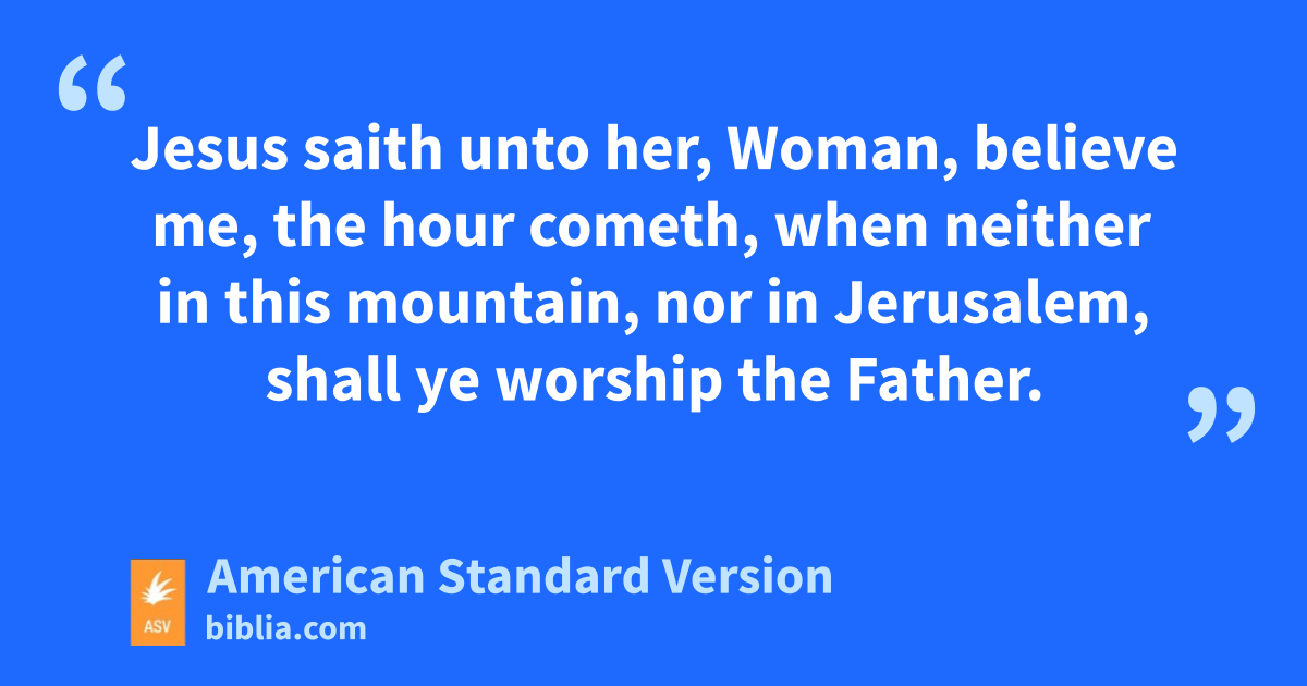 4 When therefore the Lord knew that the Pharisees had heard that Jesus was making and baptizing more disciples than John 2(although Jesus himself baptized not, but his disciples), 3he left Judaea, and departed again into Galilee. 4And he must needs pass through Samaria. 5So he cometh to a city of Samaria, called Sychar, near to the parcel of ground that Jacob gave to his son Joseph: 6and Jacob’s well was there. Jesus therefore, being wearied with his journey, sat thus by the well. It was about the sixth hour. 7There cometh a woman of Samaria to draw water: Jesus saith unto her, Give me to drink. 8For his disciples were gone away into the city to buy food. 9The Samaritan woman therefore saith unto him, How is it that thou, being a Jew, askest drink of me, who am a Samaritan woman? (For Jews have no dealings with Samaritans.) 10Jesus answered and said unto her, If thou knewest the gift of God, and who it is that saith to thee, Give me to drink; thou wouldest have asked of him, and he would have given thee living water. 11The woman saith unto him, Sir, thou hast nothing to draw with, and the well is deep: whence then hast thou that living water? 12Art thou greater than our father Jacob, who gave us the well, and drank thereof himself, and his sons, and his cattle? 13Jesus answered and said unto her, Every one that drinketh of this water shall thirst again: 14but whosoever drinketh of the water that I shall give him shall never thirst; but the water that I shall give him shall become in him a well of water springing up unto eternal life. 15The woman saith unto him, Sir, give me this water, that I thirst not, neither come all the way hither to draw. 16Jesus saith unto her, Go, call thy husband, and come hither. 17The woman answered and said unto him, I have no husband. Jesus saith unto her, Thou saidst well, I have no husband: 18for thou hast had five husbands; and he whom thou now hast is not thy husband: this hast thou said truly. 19The woman saith unto him, Sir, I perceive that thou art a prophet. 20Our fathers worshipped in this mountain; and ye say, that in Jerusalem is the place where men ought to worship. 21Jesus saith unto her, Woman, believe me, the hour cometh, when neither in this mountain, nor in Jerusalem, shall ye worship the Father. 22Ye worship that which ye know not: we worship that which we know; for salvation is from the Jews. 23But the hour cometh, and now is, when the true worshippers shall worship the Father in spirit and truth: for such doth the Father seek to be his worshippers. 24God is a Spirit: and they that worship him must worship in spirit and truth. 25The woman saith unto him, I know that Messiah cometh (he that is called Christ): when he is come, he will declare unto us all things. 26Jesus saith unto her, I that speak unto thee am he.