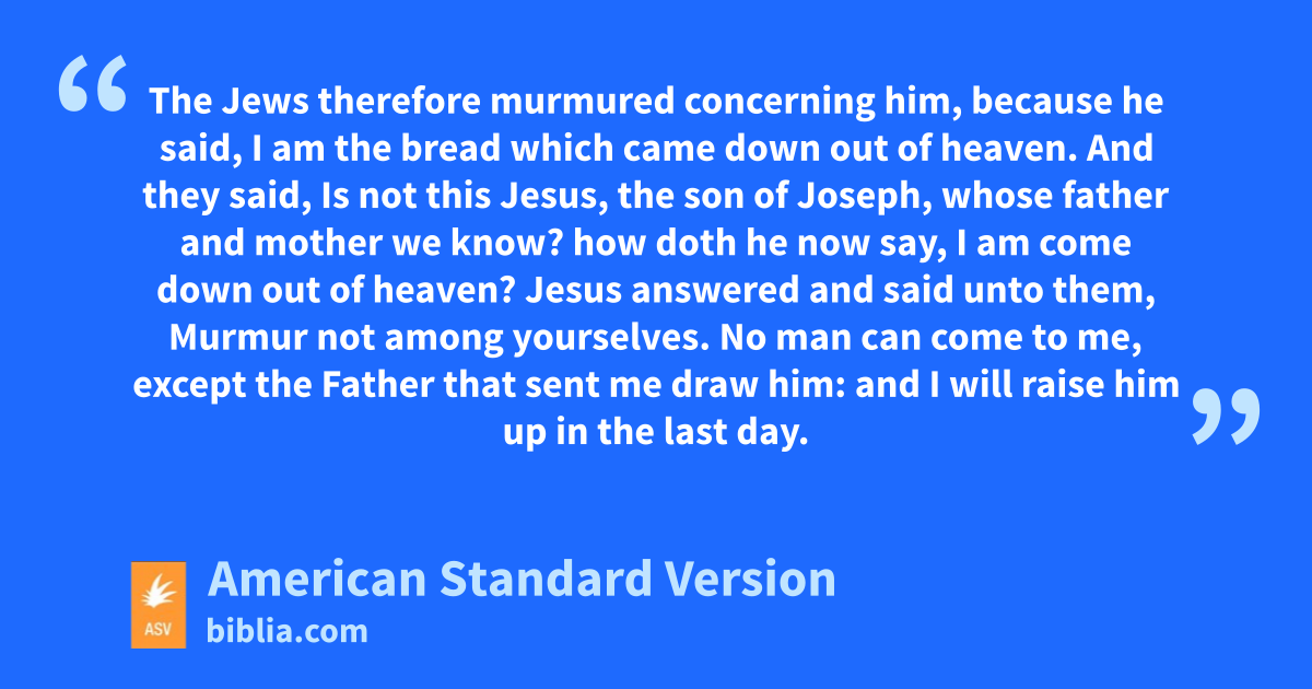 41The Jews therefore murmured concerning him, because he said, I am the bread which came down out of heaven. 42And they said, Is not this Jesus, the son of Joseph, whose father and mother we know? how doth he now say, I am come down out of heaven? 43Jesus answered and said unto them, Murmur not among yourselves. 44No man can come to me, except the Father that sent me draw him: and I will raise him up in the last day. 45It is written in the prophets, And they shall all be taught of God. Every one that hath heard from the Father, and hath learned, cometh unto me. 46Not that any man hath seen the Father, save he that is from God, he hath seen the Father. 47Verily, verily, I say unto you, He that believeth hath eternal life. 48I am the bread of life. 49Your fathers ate the manna in the wilderness, and they died. 50This is the bread which cometh down out of heaven, that a man may eat thereof, and not die. 51I am the living bread which came down out of heaven: if any man eat of this bread, he shall live for ever: yea and the bread which I will give is my flesh, for the life of the world.