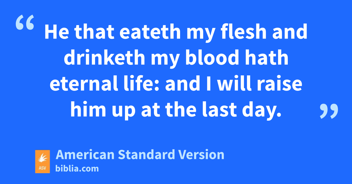 52The Jews therefore strove one with another, saying, How can this man give us his flesh to eat? 53Jesus therefore said unto them, Verily, verily, I say unto you, Except ye eat the flesh of the Son of man and drink his blood, ye have not life in yourselves. 54He that eateth my flesh and drinketh my blood hath eternal life: and I will raise him up at the last day. 55For my flesh is meat indeed, and my blood is drink indeed. 56He that eateth my flesh and drinketh my blood abideth in me, and I in him. 57As the living Father sent me, and I live because of the Father; so he that eateth me, he also shall live because of me. 58This is the bread which came down out of heaven: not as the fathers ate, and died; he that eateth this bread shall live for ever. 59These things said he in the synagogue, as he taught in Capernaum.