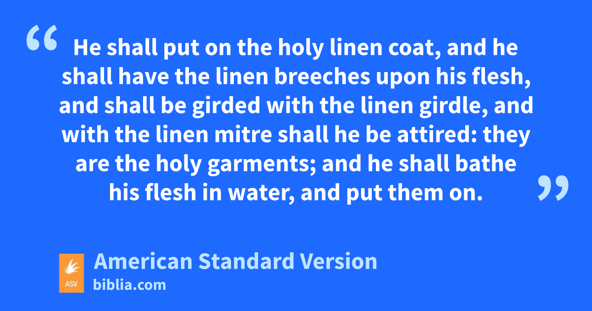 23And Aaron shall come into the tent of meeting, and shall put off the linen garments, which he put on when he went into the holy place, and shall leave them there: 24and he shall bathe his flesh in water in a holy place, and put on his garments, and come forth, and offer his burnt-offering and the burnt-offering of the people, and make atonement for himself and for the people. 25And the fat of the sin-offering shall he burn upon the altar. 26And he that letteth go the goat for Azazel shall wash his clothes, and bathe his flesh in water, and afterward he shall come into the camp. 27And the bullock of the sin-offering, and the goat of the sin-offering, whose blood was brought in to make atonement in the holy place, shall be carried forth without the camp; and they shall burn in the fire their skins, and their flesh, and their dung. 28And he that burneth them shall wash his clothes, and bathe his flesh in water, and afterward he shall come into the camp.
