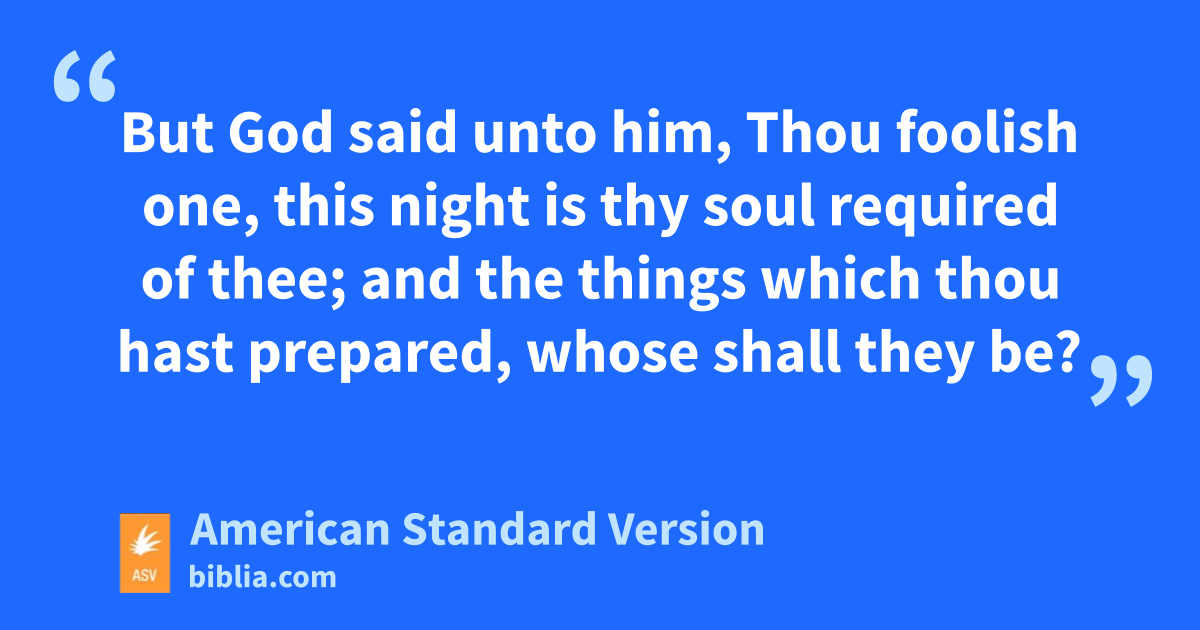 13And one out of the multitude said unto him, Teacher, bid my brother divide the inheritance with me. 14But he said unto him, Man, who made me a judge or a divider over you? 15And he said unto them, Take heed, and keep yourselves from all covetousness: for a man’s life consisteth not in the abundance of the things which he possesseth. 16And he spake a parable unto them, saying, The ground of a certain rich man brought forth plentifully: 17and he reasoned within himself, saying, What shall I do, because I have not where to bestow my fruits? 18And he said, This will I do: I will pull down my barns, and build greater; and there will I bestow all my grain and my goods. 19And I will say to my soul, Soul, thou hast much goods laid up for many years; take thine ease, eat, drink, be merry. 20But God said unto him, Thou foolish one, this night is thy soul required of thee; and the things which thou hast prepared, whose shall they be? 21So is he that layeth up treasure for himself, and is not rich toward God.