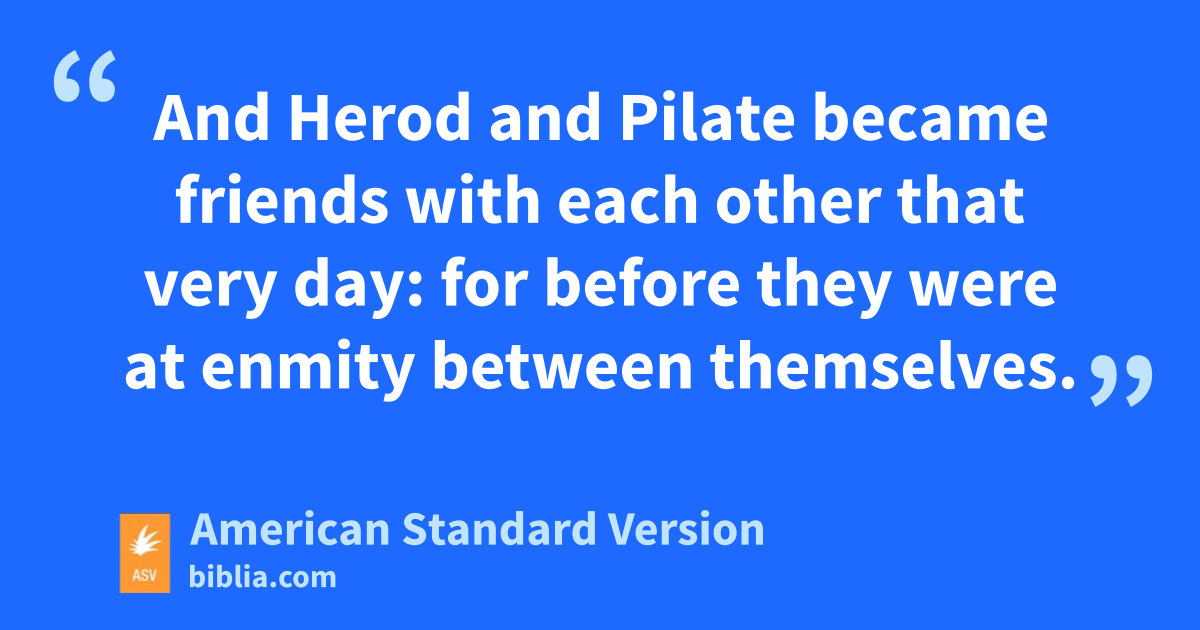 8Now when Herod saw Jesus, he was exceeding glad: for he was of a long time desirous to see him, because he had heard concerning him; and he hoped to see some miracle done by him. 9And he questioned him in many words; but he answered him nothing. 10And the chief priests and the scribes stood, vehemently accusing him. 11And Herod with his soldiers set him at nought, and mocked him, and arraying him in gorgeous apparel sent him back to Pilate. 12And Herod and Pilate became friends with each other that very day: for before they were at enmity between themselves.