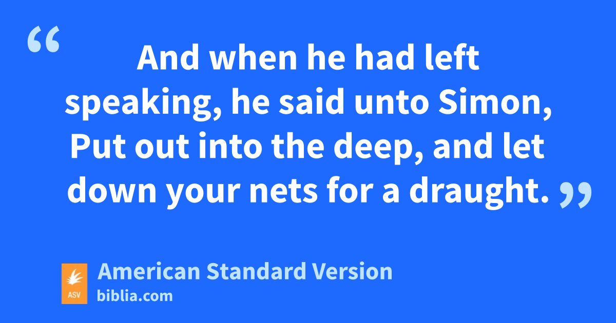 5 Now it came to pass, while the multitude pressed upon him and heard the word of God, that he was standing by the lake of Gennesaret; 2and he saw two boats standing by the lake: but the fishermen had gone out of them, and were washing their nets. 3And he entered into one of the boats, which was Simon’s, and asked him to put out a little from the land. And he sat down and taught the multitudes out of the boat. 4And when he had left speaking, he said unto Simon, Put out into the deep, and let down your nets for a draught. 5And Simon answered and said, Master, we toiled all night, and took nothing: but at thy word I will let down the nets. 6And when they had done this, they inclosed a great multitude of fishes; and their nets were breaking; 7and they beckoned unto their partners in the other boat, that they should come and help them. And they came, and filled both the boats, so that they began to sink. 8But Simon Peter, when he saw it, fell down at Jesus’ knees, saying, Depart from me; for I am a sinful man, O Lord. 9For he was amazed, and all that were with him, at the draught of the fishes which they had taken; 10and so were also James and John, sons of Zebedee, who were partners with Simon. And Jesus said unto Simon, Fear not; from henceforth thou shalt catch men. 11And when they had brought their boats to land, they left all, and followed him.