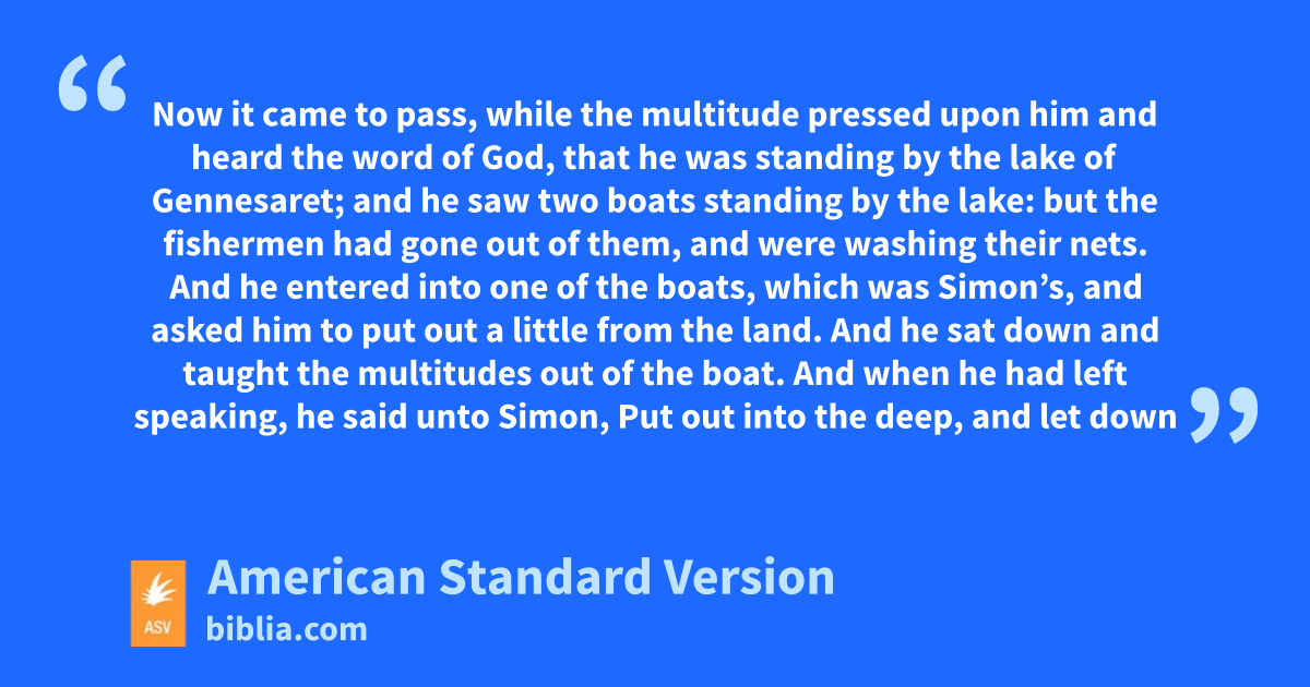 5 Now it came to pass, while the multitude pressed upon him and heard the word of God, that he was standing by the lake of Gennesaret; 2and he saw two boats standing by the lake: but the fishermen had gone out of them, and were washing their nets. 3And he entered into one of the boats, which was Simon’s, and asked him to put out a little from the land. And he sat down and taught the multitudes out of the boat. 4And when he had left speaking, he said unto Simon, Put out into the deep, and let down your nets for a draught. 5And Simon answered and said, Master, we toiled all night, and took nothing: but at thy word I will let down the nets. 6And when they had done this, they inclosed a great multitude of fishes; and their nets were breaking; 7and they beckoned unto their partners in the other boat, that they should come and help them. And they came, and filled both the boats, so that they began to sink. 8But Simon Peter, when he saw it, fell down at Jesus’ knees, saying, Depart from me; for I am a sinful man, O Lord. 9For he was amazed, and all that were with him, at the draught of the fishes which they had taken; 10and so were also James and John, sons of Zebedee, who were partners with Simon. And Jesus said unto Simon, Fear not; from henceforth thou shalt catch men. 11And when they had brought their boats to land, they left all, and followed him.