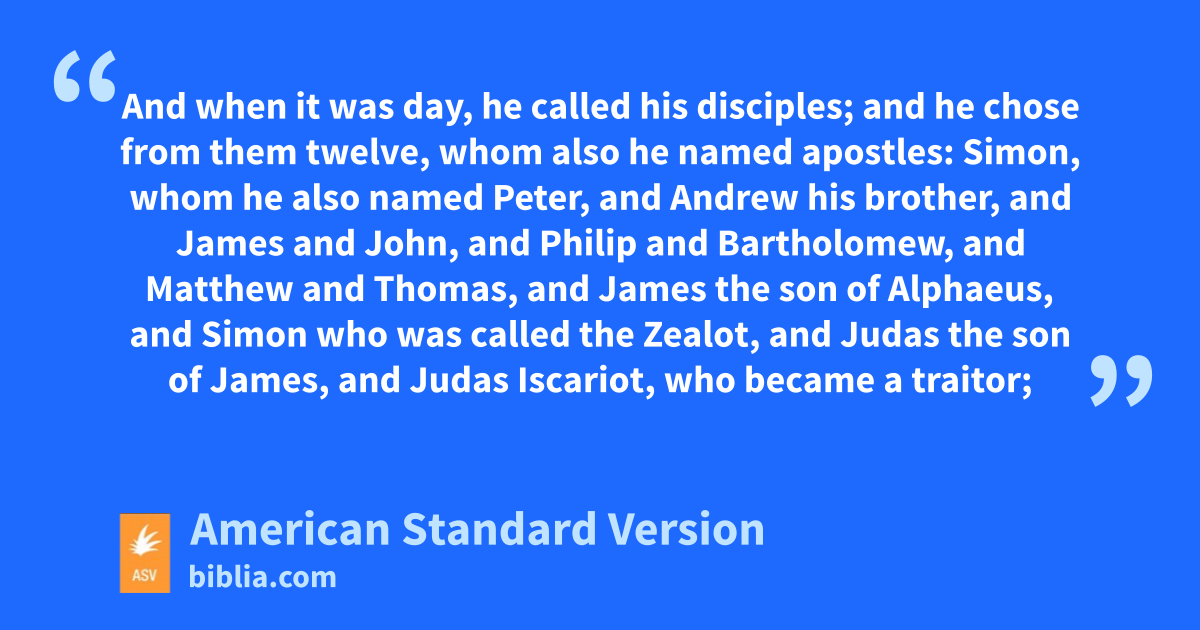 6And it came to pass on another sabbath, that he entered into the synagogue and taught: and there was a man there, and his right hand was withered. 7And the scribes and the Pharisees watched him, whether he would heal on the sabbath; that they might find how to accuse him. 8But he knew their thoughts; and he said to the man that had his hand withered. Rise up, and stand forth in the midst. And he arose and stood forth. 9And Jesus said unto them, I ask you, Is it lawful on the sabbath to do good, or to do harm? to save a life, or to destroy it? 10And he looked round about on them all, and said unto him, Stretch forth thy hand. And he did so: and his hand was restored. 11But they were filled with madness; and communed one with another what they might do to Jesus. 12And it came to pass in these days, that he went out into the mountain to pray; and he continued all night in prayer to God. 13And when it was day, he called his disciples; and he chose from them twelve, whom also he named apostles: 14Simon, whom he also named Peter, and Andrew his brother, and James and John, and Philip and Bartholomew, 15and Matthew and Thomas, and James the son of Alphaeus, and Simon who was called the Zealot, 16and Judas the son of James, and Judas Iscariot, who became a traitor; 17and he came down with them, and stood on a level place, and a great multitude of his disciples, and a great number of the people from all Judaea and Jerusalem, and the sea coast of Tyre and Sidon, who came to hear him, and to be healed of their diseases; 18and they that were troubled with unclean spirits were healed. 19And all the multitude sought to touch him; for power came forth from him, and healed them all.