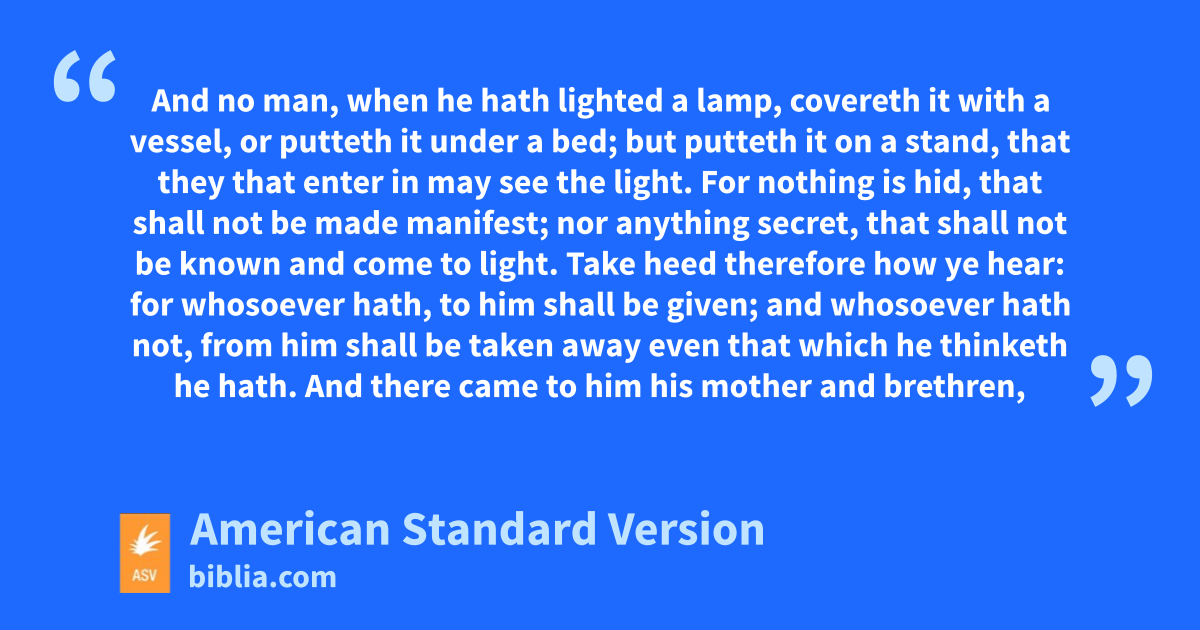 16And no man, when he hath lighted a lamp, covereth it with a vessel, or putteth it under a bed; but putteth it on a stand, that they that enter in may see the light. 17For nothing is hid, that shall not be made manifest; nor anything secret, that shall not be known and come to light. 18Take heed therefore how ye hear: for whosoever hath, to him shall be given; and whosoever hath not, from him shall be taken away even that which he thinketh he hath.