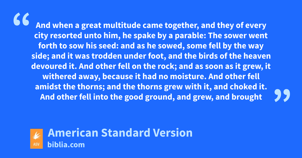 4And when a great multitude came together, and they of every city resorted unto him, he spake by a parable: 5The sower went forth to sow his seed: and as he sowed, some fell by the way side; and it was trodden under foot, and the birds of the heaven devoured it. 6And other fell on the rock; and as soon as it grew, it withered away, because it had no moisture. 7And other fell amidst the thorns; and the thorns grew with it, and choked it. 8And other fell into the good ground, and grew, and brought forth fruit a hundredfold. As he said these things, he cried, He that hath ears to hear, let him hear.