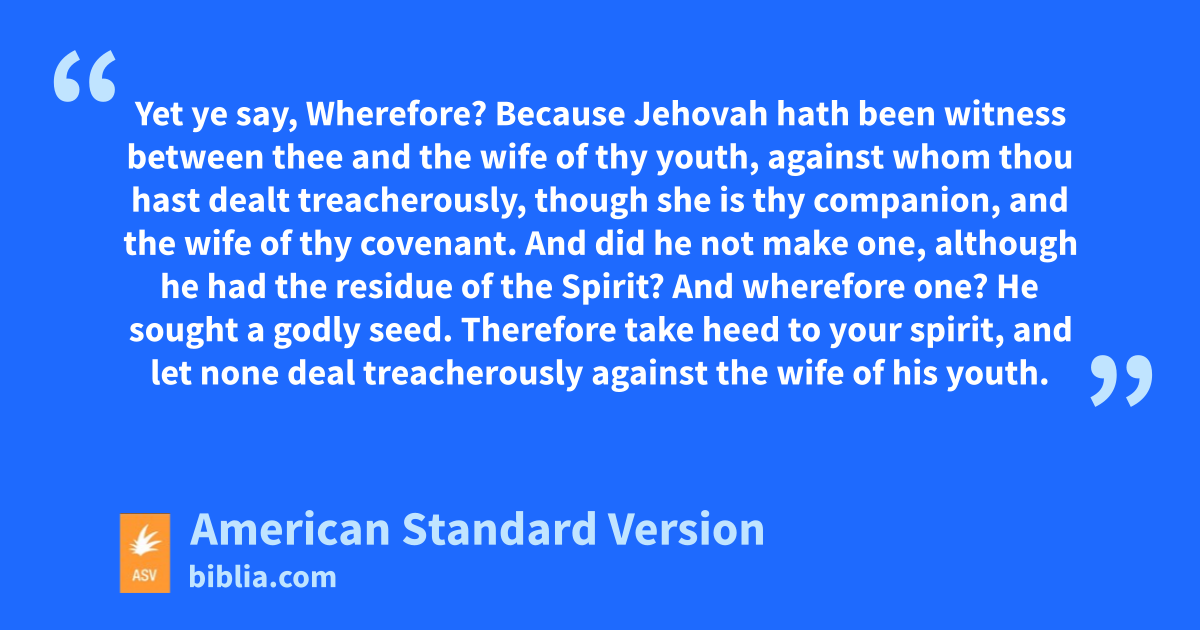 10Have we not all one father? hath not one God created us? why do we deal treacherously every man against his brother, profaning the covenant of our fathers? 11Judah hath dealt treacherously, and an abomination is committed in Israel and in Jerusalem; for Judah hath profaned the holiness of Jehovah which he loveth, and hath married the daughter of a foreign god. 12Jehovah will cut off, to the man that doeth this, him that waketh and him that answereth, out of the tents of Jacob, and him that offereth an offering unto Jehovah of hosts. 13And this again ye do: ye cover the altar of Jehovah with tears, with weeping, and with sighing, insomuch that he regardeth not the offering any more, neither receiveth it with good will at your hand. 14Yet ye say, Wherefore? Because Jehovah hath been witness between thee and the wife of thy youth, against whom thou hast dealt treacherously, though she is thy companion, and the wife of thy covenant. 15And did he not make one, although he had the residue of the Spirit? And wherefore one? He sought a godly seed. Therefore take heed to your spirit, and let none deal treacherously against the wife of his youth. 16For I hate putting away, saith Jehovah, the God of Israel, and him that covereth his garment with violence, saith Jehovah of hosts: therefore take heed to your spirit, that ye deal not treacherously.