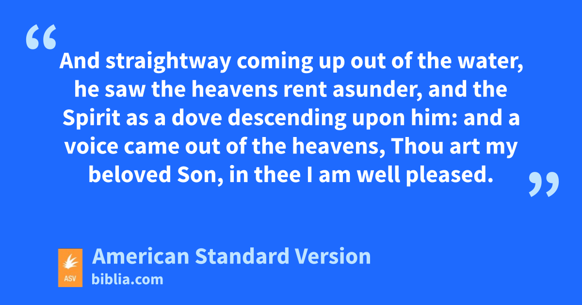 9And it came to pass in those days, that Jesus came from Nazareth of Galilee, and was baptized of John in the Jordan. 10And straightway coming up out of the water, he saw the heavens rent asunder, and the Spirit as a dove descending upon him: 11and a voice came out of the heavens, Thou art my beloved Son, in thee I am well pleased.