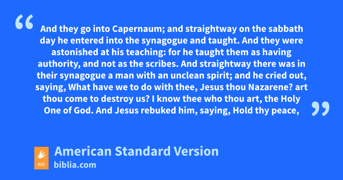 21And they go into Capernaum; and straightway on the sabbath day he entered into the synagogue and taught. 22And they were astonished at his teaching: for he taught them as having authority, and not as the scribes. 23And straightway there was in their synagogue a man with an unclean spirit; and he cried out, 24saying, What have we to do with thee, Jesus thou Nazarene? art thou come to destroy us? I know thee who thou art, the Holy One of God. 25And Jesus rebuked him, saying, Hold thy peace, and come out of him. 26And the unclean spirit, tearing him and crying with a loud voice, came out of him. 27And they were all amazed, insomuch that they questioned among themselves, saying, What is this? a new teaching! with authority he commandeth even the unclean spirits, and they obey him. 28And the report of him went out straightway everywhere into all the region of Galilee round about.