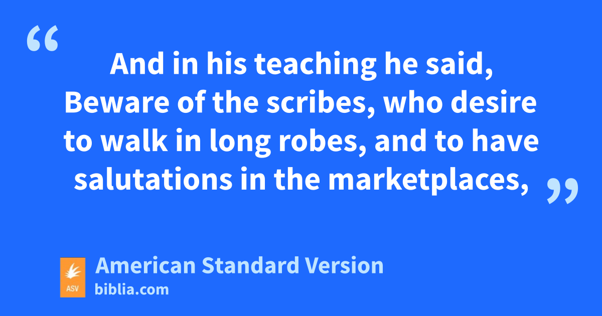 38And in his teaching he said, Beware of the scribes, who desire to walk in long robes, and to have salutations in the marketplaces, 39and chief seats in the synagogues, and chief places at feasts: 40they that devour widows’ houses, and for a pretence make long prayers; these shall receive greater condemnation.