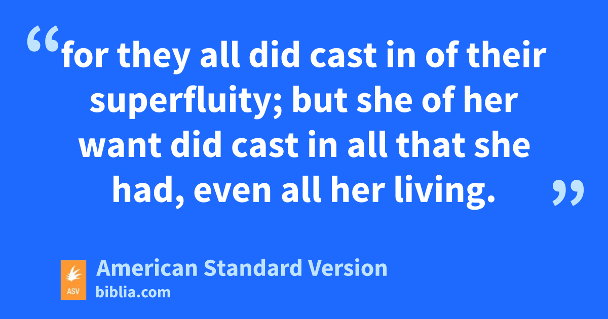 41And he sat down over against the treasury, and beheld how the multitude cast money into the treasury: and many that were rich cast in much. 42And there came a poor widow, and she cast in two mites, which make a farthing. 43And he called unto him his disciples, and said unto them, Verily I say unto you, This poor widow cast in more than all they that are casting into the treasury: 44for they all did cast in of their superfluity; but she of her want did cast in all that she had, even all her living.