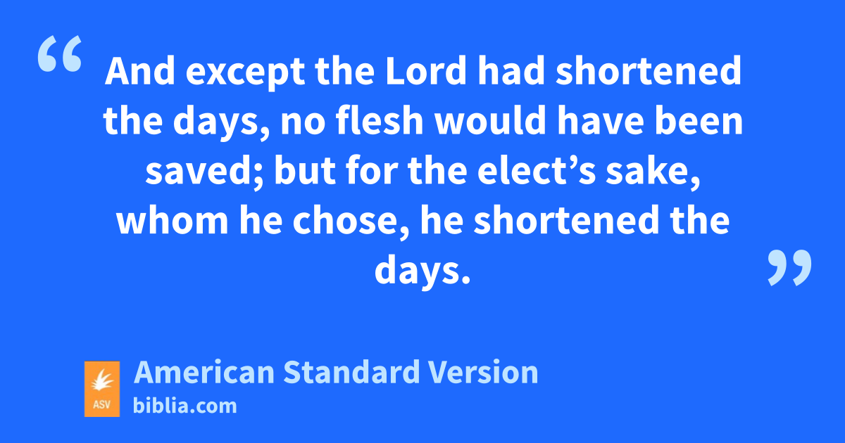 14But when ye see the abomination of desolation standing where he ought not (let him that readeth understand), then let them that are in Judaea flee unto the mountains: 15and let him that is on the housetop not go down, nor enter in, to take anything out of his house: 16and let him that is in the field not return back to take his cloak. 17But woe unto them that are with child and to them that give suck in those days! 18And pray ye that it be not in the winter. 19For those days shall be tribulation, such as there hath not been the like from the beginning of the creation which God created until now, and never shall be. 20And except the Lord had shortened the days, no flesh would have been saved; but for the elect’s sake, whom he chose, he shortened the days. 21And then if any man shall say unto you, Lo, here is the Christ; or, Lo, there; believe it not: 22for there shall arise false Christs and false prophets, and shall show signs and wonders, that they may lead astray, if possible, the elect. 23But take ye heed: behold, I have told you all things beforehand.