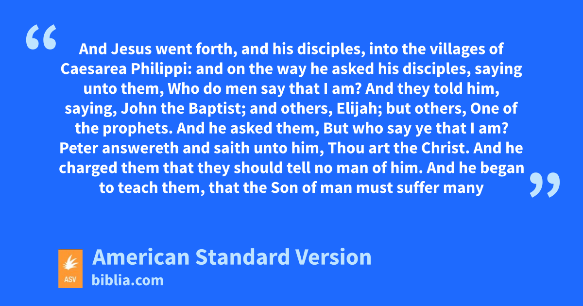 27And Jesus went forth, and his disciples, into the villages of Caesarea Philippi: and on the way he asked his disciples, saying unto them, Who do men say that I am? 28And they told him, saying, John the Baptist; and others, Elijah; but others, One of the prophets. 29And he asked them, But who say ye that I am? Peter answereth and saith unto him, Thou art the Christ. 30And he charged them that they should tell no man of him.