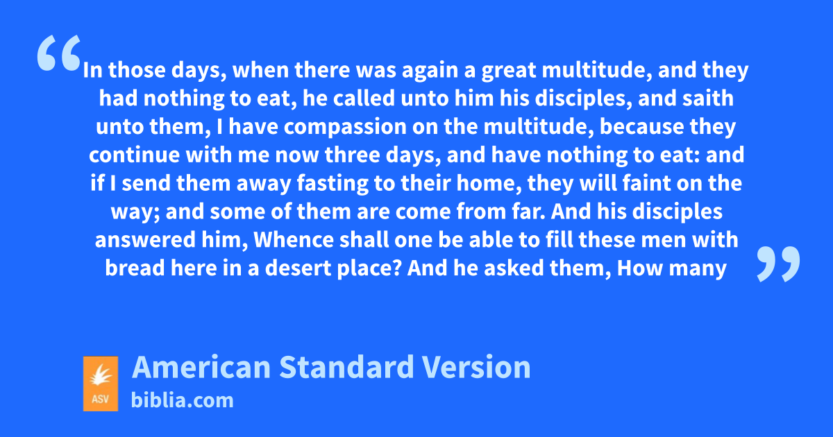 8 In those days, when there was again a great multitude, and they had nothing to eat, he called unto him his disciples, and saith unto them, 2I have compassion on the multitude, because they continue with me now three days, and have nothing to eat: 3and if I send them away fasting to their home, they will faint on the way; and some of them are come from far. 4And his disciples answered him, Whence shall one be able to fill these men with bread here in a desert place? 5And he asked them, How many loaves have ye? And they said, Seven. 6And he commandeth the multitude to sit down on the ground: and he took the seven loaves, and having given thanks, he brake, and gave to his disciples, to set before them; and they set them before the multitude. 7And they had a few small fishes: and having blessed them, he commanded to set these also before them. 8And they ate, and were filled: and they took up, of broken pieces that remained over, seven baskets. 9And they were about four thousand: and he sent them away. 10And straightway he entered into the boat with his disciples, and came into the parts of Dalmanutha.