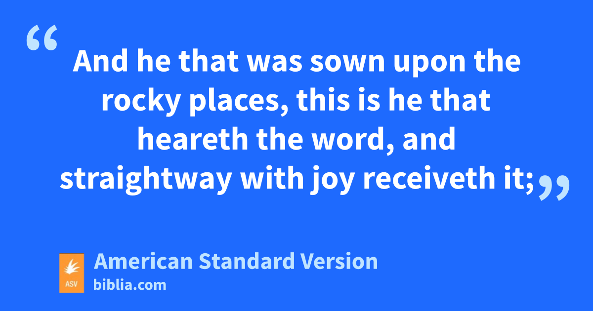 16But blessed are your eyes, for they see; and your ears, for they hear. 17For verily I say unto you, that many prophets and righteous men desired to see the things which ye see, and saw them not; and to hear the things which ye hear, and heard them not. 18Hear then ye the parable of the sower. 19When any one heareth the word of the kingdom, and understandeth it not, then cometh the evil one, and snatcheth away that which hath been sown in his heart. This is he that was sown by the way side. 20And he that was sown upon the rocky places, this is he that heareth the word, and straightway with joy receiveth it; 21yet hath he not root in himself, but endureth for a while; and when tribulation or persecution ariseth because of the word, straightway he stumbleth. 22And he that was sown among the thorns, this is he that heareth the word; and the care of the world, and the deceitfulness of riches, choke the word, and he becometh unfruitful. 23And he that was sown upon the good ground, this is he that heareth the word, and understandeth it; who verily beareth fruit, and bringeth forth, some a hundredfold, some sixty, some thirty.