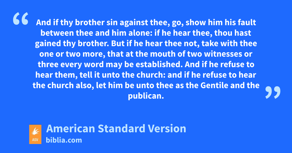 15And if thy brother sin against thee, go, show him his fault between thee and him alone: if he hear thee, thou hast gained thy brother. 16But if he hear thee not, take with thee one or two more, that at the mouth of two witnesses or three every word may be established. 17And if he refuse to hear them, tell it unto the church: and if he refuse to hear the church also, let him be unto thee as the Gentile and the publican. 18Verily I say unto you, What things soever ye shall bind on earth shall be bound in heaven; and what things soever ye shall loose on earth shall be loosed in heaven. 19Again I say unto you, that if two of you shall agree on earth as touching anything that they shall ask, it shall be done for them of my Father who is in heaven. 20For where two or three are gathered together in my name, there am I in the midst of them.