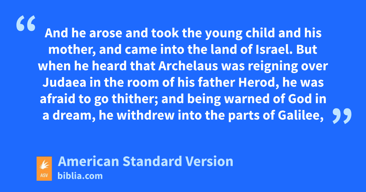 19But when Herod was dead, behold, an angel of the Lord appeareth in a dream to Joseph in Egypt, saying, 20Arise and take the young child and his mother, and go into the land of Israel: for they are dead that sought the young child’s life. 21And he arose and took the young child and his mother, and came into the land of Israel. 22But when he heard that Archelaus was reigning over Judaea in the room of his father Herod, he was afraid to go thither; and being warned of God in a dream, he withdrew into the parts of Galilee, 23and came and dwelt in a city called Nazareth; that it might be fulfilled which was spoken through the prophets, that he should be called a Nazarene.