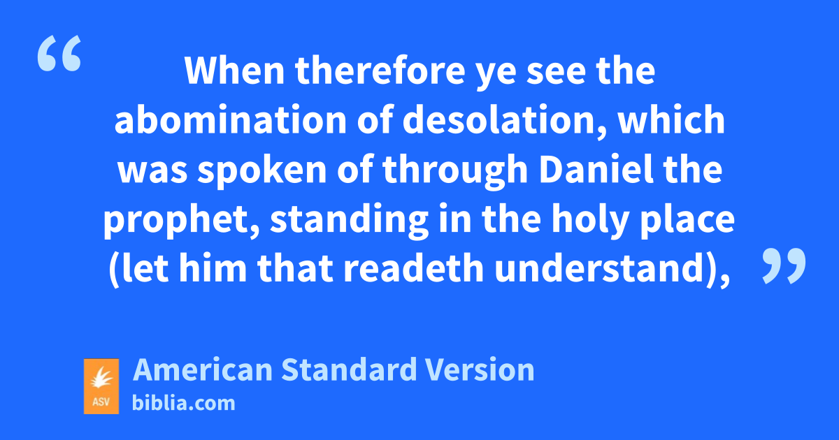 15When therefore ye see the abomination of desolation, which was spoken of through Daniel the prophet, standing in the holy place (let him that readeth understand), 16then let them that are in Judaea flee unto the mountains: 17let him that is on the housetop not go down to take out the things that are in his house: 18and let him that is in the field not return back to take his cloak. 19But woe unto them that are with child and to them that give suck in those days! 20And pray ye that your flight be not in the winter, neither on a sabbath: 21for then shall be great tribulation, such as hath not been from the beginning of the world until now, no, nor ever shall be. 22And except those days had been shortened, no flesh would have been saved: but for the elect’s sake those days shall be shortened. 23Then if any man shall say unto you, Lo, here is the Christ, or, Here; believe it not. 24For there shall arise false Christs, and false prophets, and shall show great signs and wonders; so as to lead astray, if possible, even the elect. 25Behold, I have told you beforehand. 26If therefore they shall say unto you, Behold, he is in the wilderness; go not forth: Behold, he is in the inner chambers; believe it not. 27For as the lightning cometh forth from the east, and is seen even unto the west; so shall be the coming of the Son of man. 28Wheresoever the carcase is, there will the eagles be gathered together.
