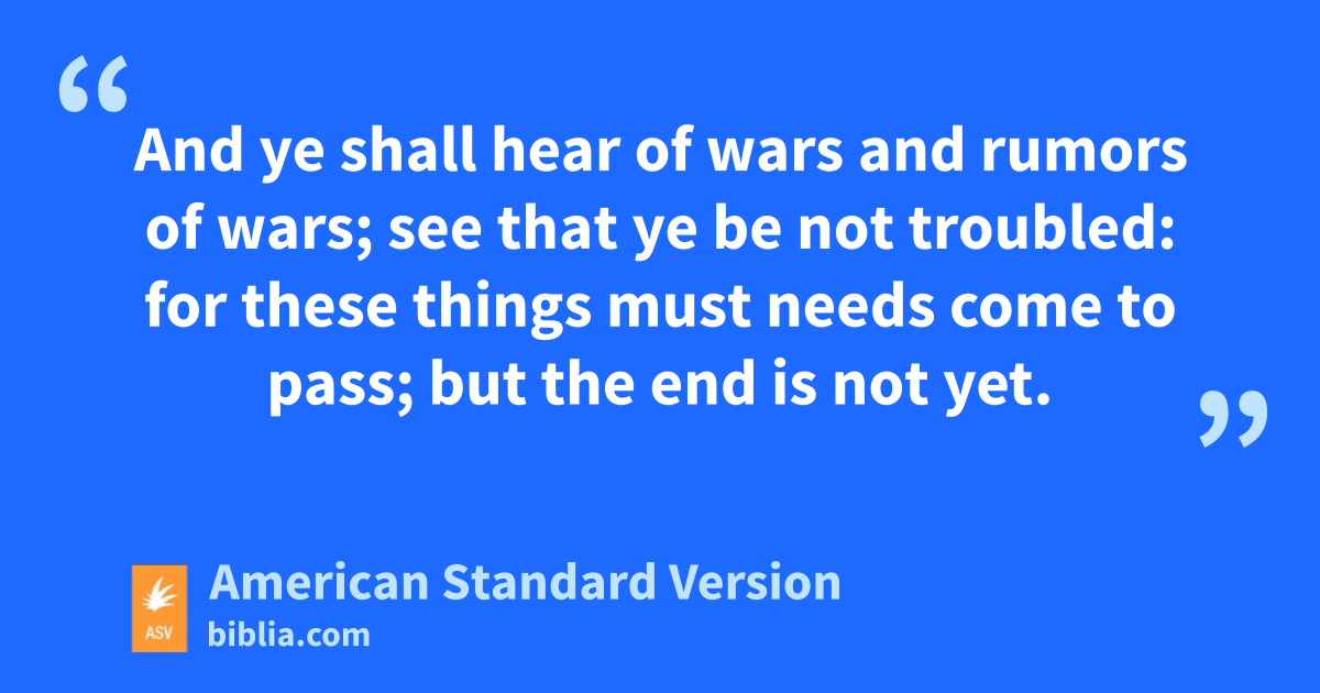 3And as he sat on the mount of Olives, the disciples came unto him privately, saying, Tell us, when shall these things be? and what shall be the sign of thy coming, and of the end of the world? 4And Jesus answered and said unto them, Take heed that no man lead you astray. 5For many shall come in my name, saying, I am the Christ; and shall lead many astray. 6And ye shall hear of wars and rumors of wars; see that ye be not troubled: for these things must needs come to pass; but the end is not yet. 7For nation shall rise against nation, and kingdom against kingdom; and there shall be famines and earthquakes in divers places. 8But all these things are the beginning of travail. 9Then shall they deliver you up unto tribulation, and shall kill you: and ye shall be hated of all the nations for my name’s sake. 10And then shall many stumble, and shall deliver up one another, and shall hate one another. 11And many false prophets shall arise, and shall lead many astray. 12And because iniquity shall be multiplied, the love of the many shall wax cold. 13But he that endureth to the end, the same shall be saved. 14And this gospel of the kingdom shall be preached in the whole world for a testimony unto all the nations; and then shall the end come.
