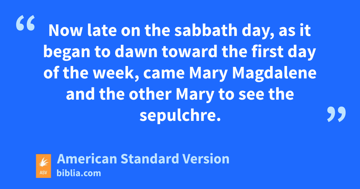 28 Now late on the sabbath day, as it began to dawn toward the first day of the week, came Mary Magdalene and the other Mary to see the sepulchre. 2And behold, there was a great earthquake; for an angel of the Lord descended from heaven, and came and rolled away the stone, and sat upon it. 3His appearance was as lightning, and his raiment white as snow: 4and for fear of him the watchers did quake, and became as dead men. 5And the angel answered and said unto the women, Fear not ye; for I know that ye seek Jesus, who hath been crucified. 6He is not here; for he is risen, even as he said. Come, see the place where the Lord lay. 7And go quickly, and tell his disciples, He is risen from the dead; and lo, he goeth before you into Galilee; there shall ye see him: lo, I have told you. 8And they departed quickly from the tomb with fear and great joy, and ran to bring his disciples word. 9And behold, Jesus met them, saying, All hail. And they came and took hold of his feet, and worshipped him. 10Then saith Jesus unto them, Fear not: go tell my brethren that they depart into Galilee, and there shall they see me.