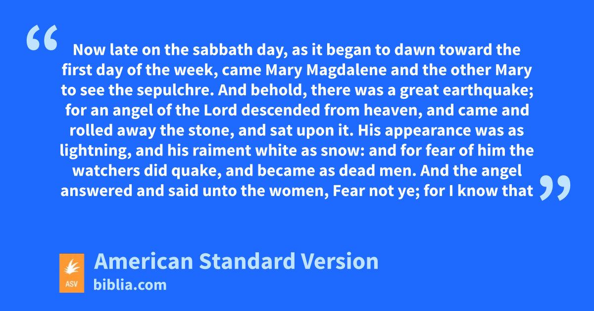 28 Now late on the sabbath day, as it began to dawn toward the first day of the week, came Mary Magdalene and the other Mary to see the sepulchre. 2And behold, there was a great earthquake; for an angel of the Lord descended from heaven, and came and rolled away the stone, and sat upon it. 3His appearance was as lightning, and his raiment white as snow: 4and for fear of him the watchers did quake, and became as dead men. 5And the angel answered and said unto the women, Fear not ye; for I know that ye seek Jesus, who hath been crucified. 6He is not here; for he is risen, even as he said. Come, see the place where the Lord lay. 7And go quickly, and tell his disciples, He is risen from the dead; and lo, he goeth before you into Galilee; there shall ye see him: lo, I have told you. 8And they departed quickly from the tomb with fear and great joy, and ran to bring his disciples word. 9And behold, Jesus met them, saying, All hail. And they came and took hold of his feet, and worshipped him. 10Then saith Jesus unto them, Fear not: go tell my brethren that they depart into Galilee, and there shall they see me.