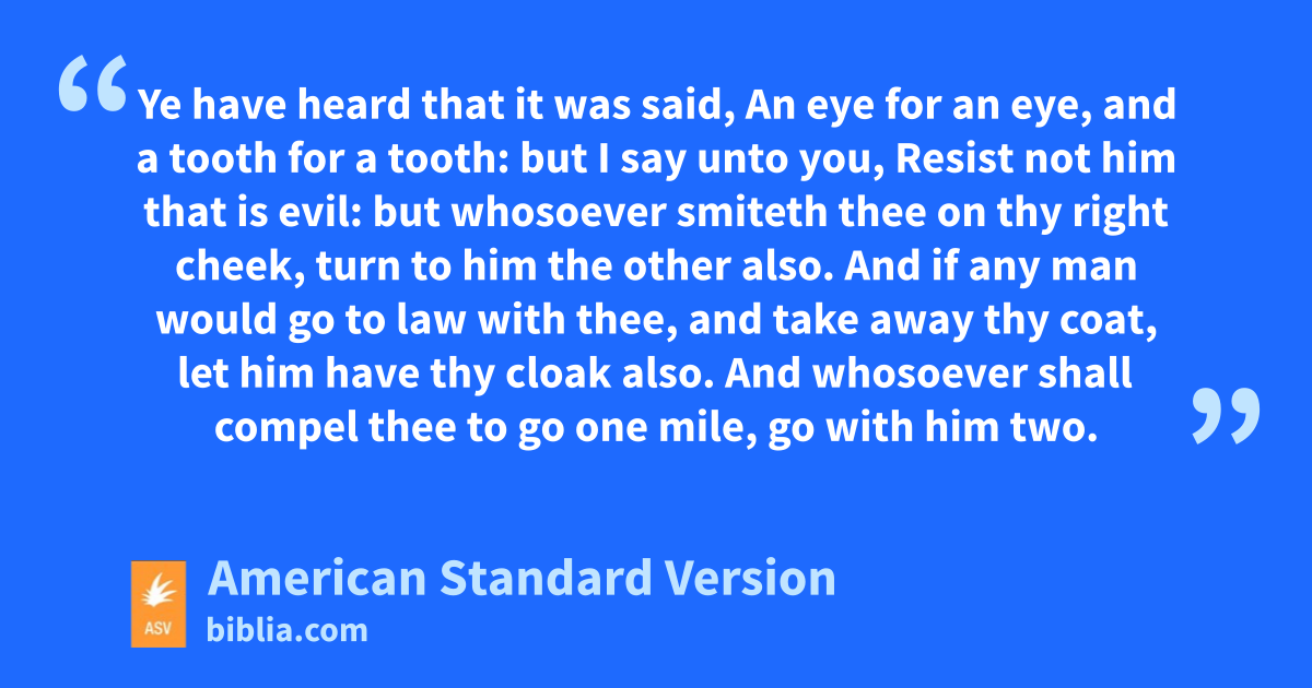 38Ye have heard that it was said, An eye for an eye, and a tooth for a tooth: 39but I say unto you, Resist not him that is evil: but whosoever smiteth thee on thy right cheek, turn to him the other also. 40And if any man would go to law with thee, and take away thy coat, let him have thy cloak also. 41And whosoever shall compel thee to go one mile, go with him two. 42Give to him that asketh thee, and from him that would borrow of thee turn not thou away.