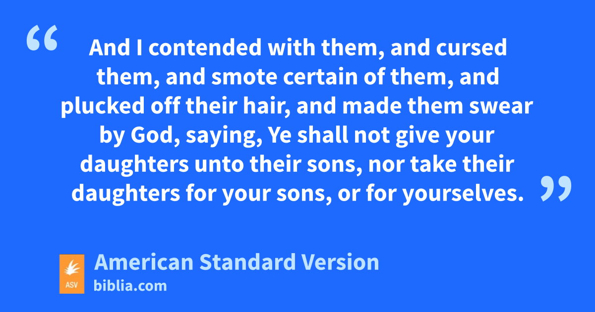 23In those days also saw I the Jews that had married women of Ashdod, of Ammon, and of Moab: 24and their children spake half in the speech of Ashdod, and could not speak in the Jews’ language, but according to the language of each people. 25And I contended with them, and cursed them, and smote certain of them, and plucked off their hair, and made them swear by God, saying, Ye shall not give your daughters unto their sons, nor take their daughters for your sons, or for yourselves. 26Did not Solomon king of Israel sin by these things? yet among many nations was there no king like him, and he was beloved of his God, and God made him king over all Israel: nevertheless even him did foreign women cause to sin. 27Shall we then hearken unto you to do all this great evil, to trespass against our God in marrying foreign women?