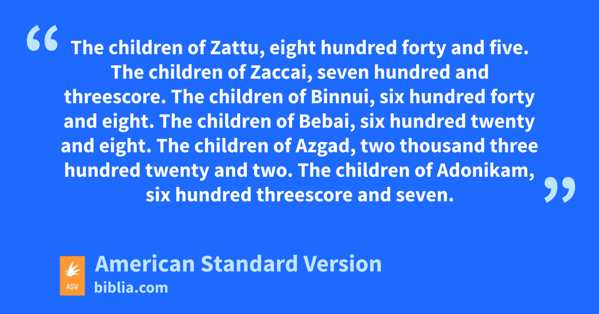 The number of the men of the people of Israel: 8The children of Parosh, two thousand a hundred and seventy and two. 9The children of Shephatiah, three hundred seventy and two. 10The children of Arah, six hundred fifty and two. 11The children of Pahath-moab, of the children of Jeshua and Joab, two thousand and eight hundred and eighteen. 12The children of Elam, a thousand two hundred fifty and four. 13The children of Zattu, eight hundred forty and five. 14The children of Zaccai, seven hundred and threescore. 15The children of Binnui, six hundred forty and eight. 16The children of Bebai, six hundred twenty and eight. 17The children of Azgad, two thousand three hundred twenty and two. 18The children of Adonikam, six hundred threescore and seven. 19The children of Bigvai, two thousand threescore and seven. 20The children of Adin, six hundred fifty and five. 21The children of Ater, of Hezekiah, ninety and eight. 22The children of Hashum, three hundred twenty and eight. 23The children of Bezai, three hundred twenty and four. 24The children of Hariph, a hundred and twelve. 25The children of Gibeon, ninety and five. 26The men of Beth-lehem and Netophah, a hundred fourscore and eight. 27The men of Anathoth, a hundred twenty and eight. 28The men of Beth-azmaveth, forty and two. 29The men of Kiriath-jearim, Chephirah, and Beeroth, seven hundred forty and three. 30The men of Ramah and Geba, six hundred twenty and one. 31The men of Michmas, a hundred and twenty and two. 32The men of Beth-el and Ai, a hundred twenty and three. 33The men of the other Nebo, fifty and two. 34The children of the other Elam, a thousand two hundred fifty and four. 35The children of Harim, three hundred and twenty. 36The children of Jericho, three hundred forty and five. 37The children of Lod, Hadid, and Ono, seven hundred twenty and one. 38The children of Senaah, three thousand nine hundred and thirty.