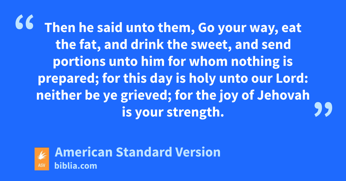 9And Nehemiah, who was the governor, and Ezra the priest the scribe, and the Levites that taught the people, said unto all the people, This day is holy unto Jehovah your God; mourn not, nor weep. For all the people wept, when they heard the words of the law. 10Then he said unto them, Go your way, eat the fat, and drink the sweet, and send portions unto him for whom nothing is prepared; for this day is holy unto our Lord: neither be ye grieved; for the joy of Jehovah is your strength. 11So the Levites stilled all the people, saying, Hold your peace, for the day is holy; neither be ye grieved. 12And all the people went their way to eat, and to drink, and to send portions, and to make great mirth, because they had understood the words that were declared unto them.