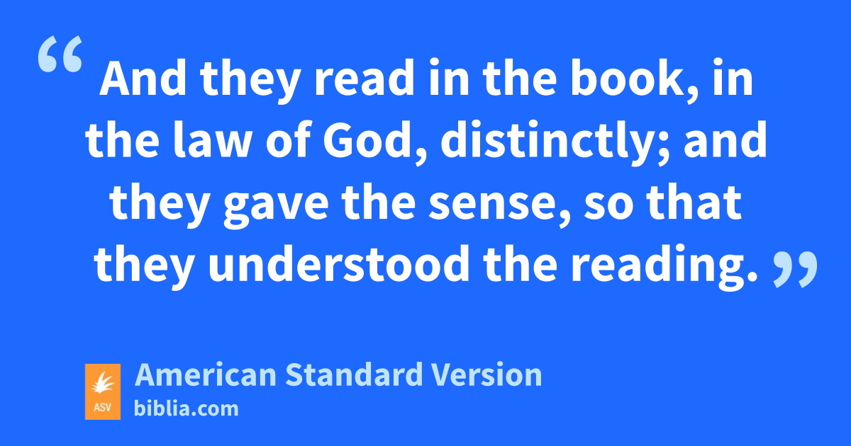 8 And all the people gathered themselves together as one man into the broad place that was before the water gate; and they spake unto Ezra the scribe to bring the book of the law of Moses, which Jehovah had commanded to Israel. 2And Ezra the priest brought the law before the assembly, both men and women, and all that could hear with understanding, upon the first day of the seventh month. 3And he read therein before the broad place that was before the water gate from early morning until midday, in the presence of the men and the women, and of those that could understand; and the ears of all the people were attentive unto the book of the law. 4And Ezra the scribe stood upon a pulpit of wood, which they had made for the purpose; and beside him stood Mattithiah, and Shema, and Anaiah, and Uriah, and Hilkiah, and Maaseiah, on his right hand; and on his left hand, Pedaiah, and Mishael, and Malchijah, and Hashum, and Hashbaddanah, Zechariah, and Meshullam. 5And Ezra opened the book in the sight of all the people; (for he was above all the people;) and when he opened it, all the people stood up. 6And Ezra blessed Jehovah, the great God: and all the people answered, Amen, Amen, with the lifting up of their hands: and they bowed their heads, and worshipped Jehovah with their faces to the ground. 7Also Jeshua, and Bani, and Sherebiah, Jamin, Akkub, Shabbethai, Hodiah, Maaseiah, Kelita, Azariah, Jozabad, Hanan, Pelaiah, and the Levites, caused the people to understand the law: and the people stood in their place. 8And they read in the book, in the law of God, distinctly; and they gave the sense, so that they understood the reading.