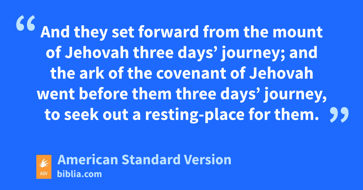 33And they set forward from the mount of Jehovah three days’ journey; and the ark of the covenant of Jehovah went before them three days’ journey, to seek out a resting-place for them. 34And the cloud of Jehovah was over them by day, when they set forward from the camp.