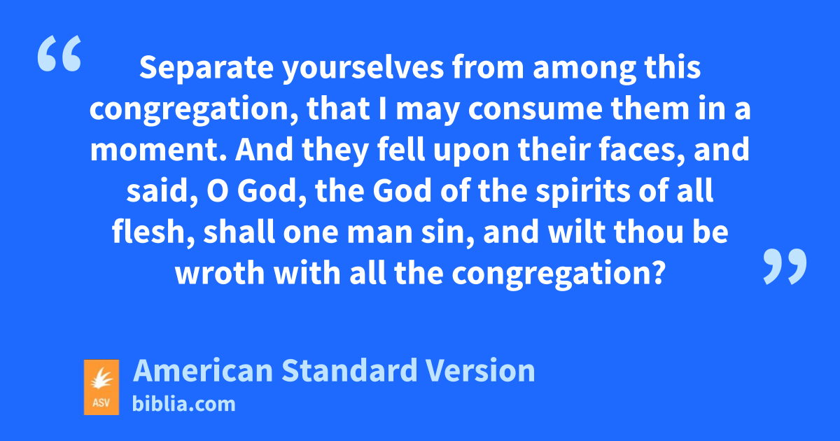 20And Jehovah spake unto Moses and unto Aaron, saying, 21Separate yourselves from among this congregation, that I may consume them in a moment. 22And they fell upon their faces, and said, O God, the God of the spirits of all flesh, shall one man sin, and wilt thou be wroth with all the congregation? 23And Jehovah spake unto Moses, saying, 24Speak unto the congregation, saying, Get you up from about the tabernacle of Korah, Dathan, and Abiram.