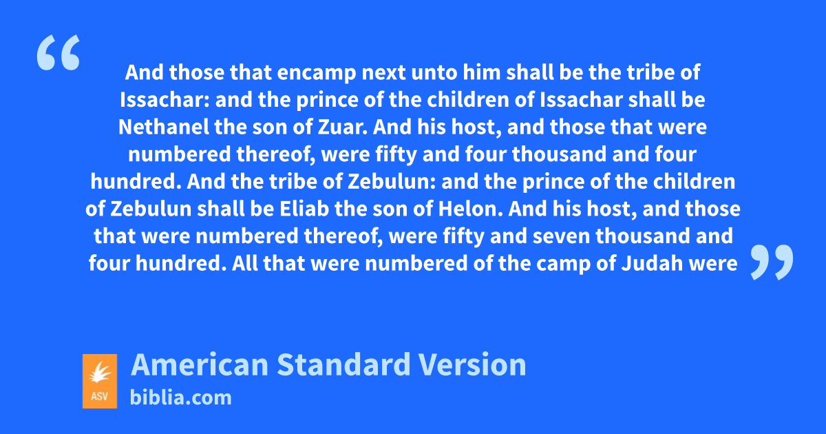 2 And Jehovah spake unto Moses and unto Aaron, saying, 2The children of Israel shall encamp every man by his own standard, with the ensigns of their fathers’ houses: over against the tent of meeting shall they encamp round about. 3And those that encamp on the east side toward the sunrising shall be they of the standard of the camp of Judah, according to their hosts: and the prince of the children of Judah shall be Nahshon the son of Amminadab. 4And his host, and those that were numbered of them, were threescore and fourteen thousand and six hundred. 5And those that encamp next unto him shall be the tribe of Issachar: and the prince of the children of Issachar shall be Nethanel the son of Zuar. 6And his host, and those that were numbered thereof, were fifty and four thousand and four hundred. 7And the tribe of Zebulun: and the prince of the children of Zebulun shall be Eliab the son of Helon. 8And his host, and those that were numbered thereof, were fifty and seven thousand and four hundred. 9All that were numbered of the camp of Judah were a hundred thousand and fourscore thousand and six thousand and four hundred, according to their hosts. They shall set forth first.
