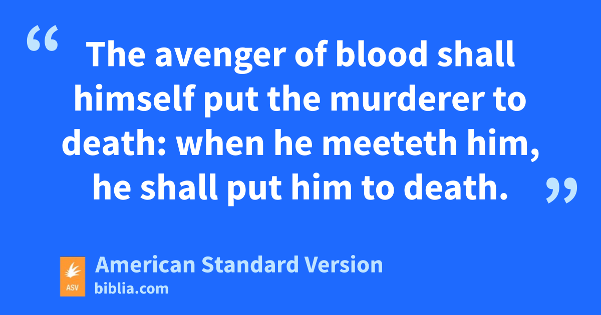16But if he smote him with an instrument of iron, so that he died, he is a murderer: the murderer shall surely be put to death. 17And if he smote him with a stone in the hand, whereby a man may die, and he died, he is a murderer: the murderer shall surely be put to death. 18Or if he smote him with a weapon of wood in the hand, whereby a man may die, and he died, he is a murderer: the murderer shall surely be put to death. 19The avenger of blood shall himself put the murderer to death: when he meeteth him, he shall put him to death. 20And if he thrust him of hatred, or hurled at him, lying in wait, so that he died, 21or in enmity smote him with his hand, so that he died; he that smote him shall surely be put to death; he is a murderer: the avenger of blood shall put the murderer to death, when he meeteth him.