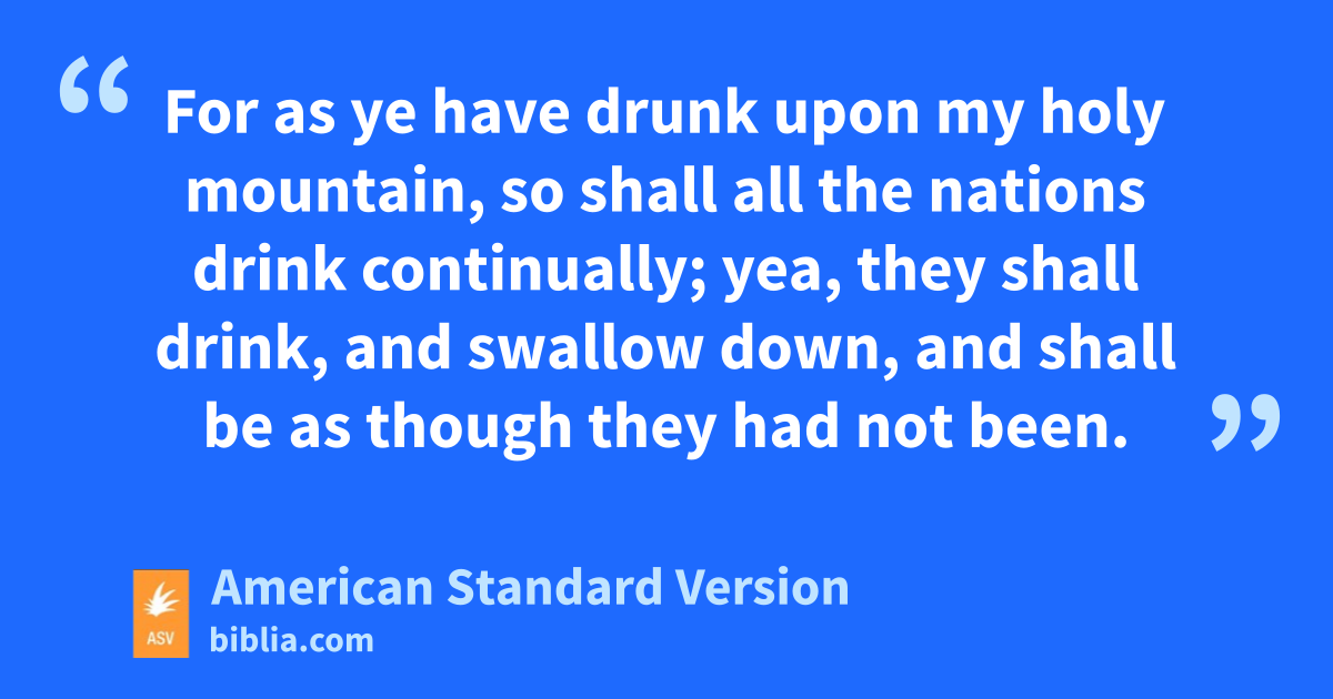 15For the day of Jehovah is near upon all the nations: as thou hast done, it shall be done unto thee; thy dealing shall return upon thine own head. 16For as ye have drunk upon my holy mountain, so shall all the nations drink continually; yea, they shall drink, and swallow down, and shall be as though they had not been.