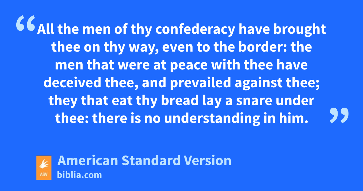 5If thieves came to thee, if robbers by night (how art thou cut off!), would they not steal only till they had enough? if grape-gatherers came to thee, would they not leave some gleaning grapes? 6How are the things of Esau searched! how are his hidden treasures sought out! 7All the men of thy confederacy have brought thee on thy way, even to the border: the men that were at peace with thee have deceived thee, and prevailed against thee; they that eat thy bread lay a snare under thee: there is no understanding in him. 8Shall I not in that day, saith Jehovah, destroy the wise men out of Edom, and understanding out of the mount of Esau? 9And thy mighty men, O Teman, shall be dismayed, to the end that every one may be cut off from the mount of Esau by slaughter.