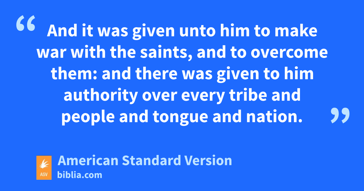 And I saw a beast coming up out of the sea, having ten horns and seven heads, and on his horns ten diadems, and upon his heads names of blasphemy. 2And the beast which I saw was like unto a leopard, and his feet were as the feet of a bear, and his mouth as the mouth of a lion: and the dragon gave him his power, and his throne, and great authority. 3And I saw one of his heads as though it had been smitten unto death; and his death-stroke was healed: and the whole earth wondered after the beast; 4and they worshipped the dragon, because he gave his authority unto the beast; and they worshipped the beast, saying, Who is like unto the beast? and who is able to war with him? 5and there was given to him a mouth speaking great things and blasphemies; and there was given to him authority to continue forty and two months. 6And he opened his mouth for blasphemies against God, to blaspheme his name, and his tabernacle, even them that dwell in the heaven. 7And it was given unto him to make war with the saints, and to overcome them: and there was given to him authority over every tribe and people and tongue and nation. 8And all that dwell on the earth shall worship him, every one whose name hath not been written from the foundation of the world in the book of life of the Lamb that hath been slain. 9If any man hath an ear, let him hear. 10If any man is for captivity, into captivity he goeth: if any man shall kill with the sword, with the sword must he be killed. Here is the patience and the faith of the saints.