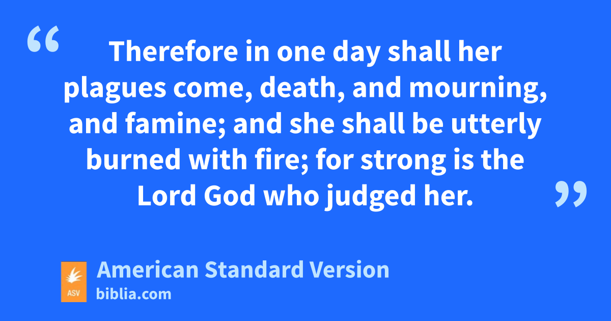 4And I heard another voice from heaven, saying, Come forth, my people, out of her, that ye have no fellowship with her sins, and that ye receive not of her plagues: 5for her sins have reached even unto heaven, and God hath remembered her iniquities. 6Render unto her even as she rendered, and double unto her the double according to her works: in the cup which she mingled, mingle unto her double. 7How much soever she glorified herself, and waxed wanton, so much give her of torment and mourning: for she saith in her heart, I sit a queen, and am no widow, and shall in no wise see mourning. 8Therefore in one day shall her plagues come, death, and mourning, and famine; and she shall be utterly burned with fire; for strong is the Lord God who judged her. 9And the kings of the earth, who committed fornication and lived wantonly with her, shall weep and wail over her, when they look upon the smoke of her burning, 10standing afar off for the fear of her torment, saying, Woe, woe, the great city, Babylon, the strong city! for in one hour is thy judgment come. 11And the merchants of the earth weep and mourn over her, for no man buyeth their merchandise any more; 12merchandise of gold, and silver, and precious stone, and pearls, and fine linen, and purple, and silk, and scarlet; and all thyine wood, and every vessel of ivory, and every vessel made of most precious wood, and of brass, and iron, and marble; 13and cinnamon, and spice, and incense, and ointment, and frankincense, and wine, and oil, and fine flour, and wheat, and cattle, and sheep; and merchandise of horses and chariots and slaves; and souls of men. 14And the fruits which thy soul lusted after are gone from thee, and all things that were dainty and sumptuous are perished from thee, and men shall find them no more at all. 15The merchants of these things, who were made rich by her, shall stand afar off for the fear of her torment, weeping and mourning; 16saying, Woe, woe, the great city, she that was arrayed in fine linen and purple and scarlet, and decked with gold and precious stone and pearl! 17for in one hour so great riches is made desolate. And every shipmaster, and every one that saileth any whither, and mariners, and as many as gain their living by sea, stood afar off, 18and cried out as they looked upon the smoke of her burning, saying, What city is like the great city? 19And they cast dust on their heads, and cried, weeping and mourning, saying, Woe, woe, the great city, wherein all that had their ships in the sea were made rich by reason of her costliness! for in one hour is she made desolate. 20Rejoice over her, thou heaven, and ye saints, and ye apostles, and ye prophets; for God hath judged your judgment on her.