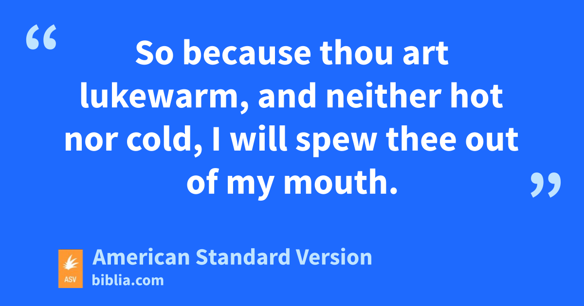 These things saith the Amen, the faithful and true witness, the beginning of the creation of God: 15I know thy works, that thou art neither cold nor hot: I would thou wert cold or hot. 16So because thou art lukewarm, and neither hot nor cold, I will spew thee out of my mouth. 17Because thou sayest, I am rich, and have gotten riches, and have need of nothing; and knowest not that thou art the wretched one and miserable and poor and blind and naked: 18I counsel thee to buy of me gold refined by fire, that thou mayest become rich; and white garments, that thou mayest clothe thyself, and that the shame of thy nakedness be not made manifest; and eyesalve to anoint thine eyes, that thou mayest see. 19As many as I love, I reprove and chasten: be zealous therefore, and repent. 20Behold, I stand at the door and knock: if any man hear my voice and open the door, I will come in to him, and will sup with him, and he with me. 21He that overcometh, I will give to him to sit down with me in my throne, as I also overcame, and sat down with my Father in his throne. 22He that hath an ear, let him hear what the Spirit saith to the churches.
