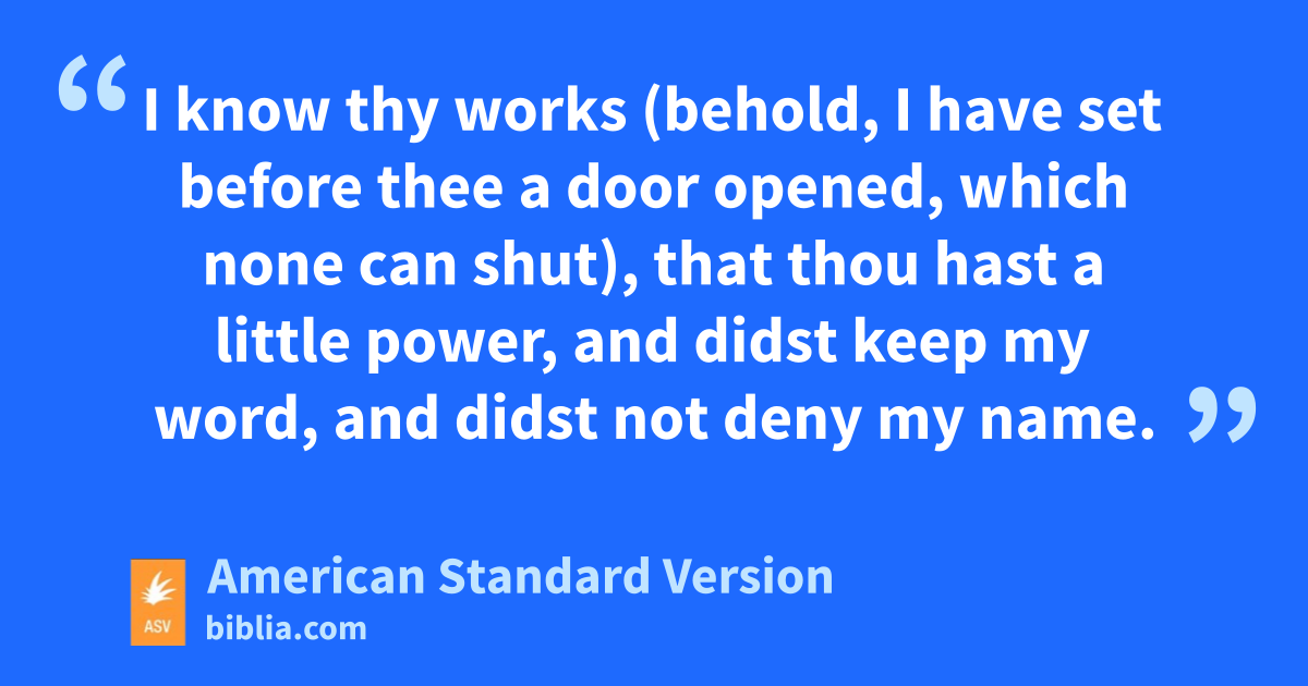 These things saith he that is holy, he that is true, he that hath the key of David, he that openeth and none shall shut, and that shutteth and none openeth: 8I know thy works (behold, I have set before thee a door opened, which none can shut), that thou hast a little power, and didst keep my word, and didst not deny my name. 9Behold, I give of the synagogue of Satan, of them that say they are Jews, and they are not, but do lie; behold, I will make them to come and worship before thy feet, and to know that I have loved thee. 10Because thou didst keep the word of my patience, I also will keep thee from the hour of trial, that hour which is to come upon the whole world, to try them that dwell upon the earth. 11I come quickly: hold fast that which thou hast, that no one take thy crown. 12He that overcometh, I will make him a pillar in the temple of my God, and he shall go out thence no more: and I will write upon him the name of my God, and the name of the city of my God, the new Jerusalem, which cometh down out of heaven from my God, and mine own new name. 13He that hath an ear, let him hear what the Spirit saith to the churches.