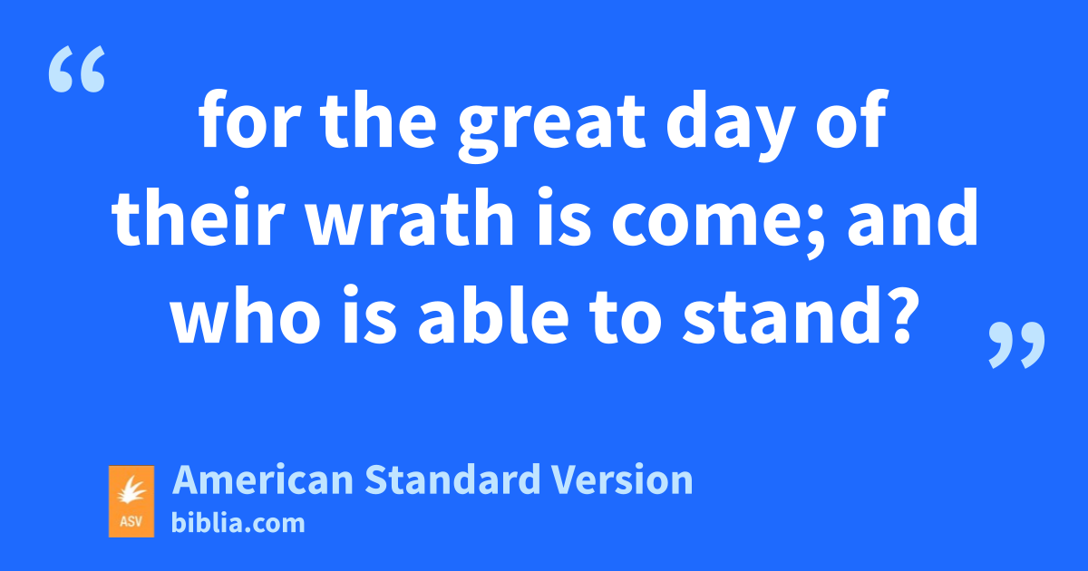 12And I saw when he opened the sixth seal, and there was a great earthquake; and the sun became black as sackcloth of hair, and the whole moon became as blood; 13and the stars of the heaven fell unto the earth, as a fig tree casteth her unripe figs when she is shaken of a great wind. 14And the heaven was removed as a scroll when it is rolled up; and every mountain and island were moved out of their places. 15And the kings of the earth, and the princes, and the chief captains, and the rich, and the strong, and every bondman and freeman, hid themselves in the caves and in the rocks of the mountains; 16and they say to the mountains and to the rocks, Fall on us, and hide us from the face of him that sitteth on the throne, and from the wrath of the Lamb: 17for the great day of their wrath is come; and who is able to stand?