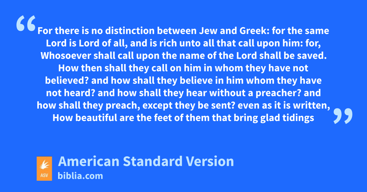 10 Brethren, my heart’s desire and my supplication to God is for them, that they may be saved. 2For I bear them witness that they have a zeal for God, but not according to knowledge. 3For being ignorant of God’s righteousness, and seeking to establish their own, they did not subject themselves to the righteousness of God. 4For Christ is the end of the law unto righteousness to every one that believeth. 5For Moses writeth that the man that doeth the righteousness which is of the law shall live thereby. 6But the righteousness which is of faith saith thus, Say not in thy heart, Who shall ascend into heaven? (that is, to bring Christ down:) 7or, Who shall descend into the abyss? (that is, to bring Christ up from the dead.) 8But what saith it? The word is nigh thee, in thy mouth, and in thy heart: that is, the word of faith, which we preach: 9because if thou shalt confess with thy mouth Jesus as Lord, and shalt believe in thy heart that God raised him from the dead, thou shalt be saved: 10for with the heart man believeth unto righteousness; and with the mouth confession is made unto salvation. 11For the scripture saith, Whosoever believeth on him shall not be put to shame. 12For there is no distinction between Jew and Greek: for the same Lord is Lord of all, and is rich unto all that call upon him: 13for, Whosoever shall call upon the name of the Lord shall be saved. 14How then shall they call on him in whom they have not believed? and how shall they believe in him whom they have not heard? and how shall they hear without a preacher? 15and how shall they preach, except they be sent? even as it is written, How beautiful are the feet of them that bring glad tidings of good things!