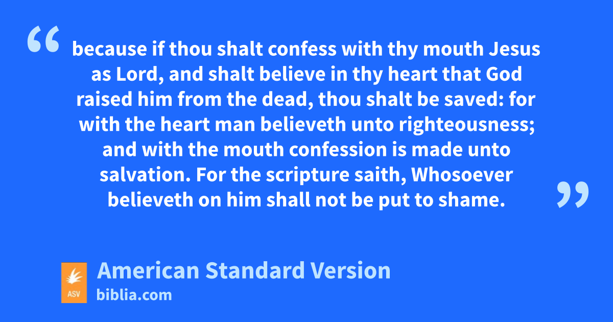 10 Brethren, my heart’s desire and my supplication to God is for them, that they may be saved. 2For I bear them witness that they have a zeal for God, but not according to knowledge. 3For being ignorant of God’s righteousness, and seeking to establish their own, they did not subject themselves to the righteousness of God. 4For Christ is the end of the law unto righteousness to every one that believeth. 5For Moses writeth that the man that doeth the righteousness which is of the law shall live thereby. 6But the righteousness which is of faith saith thus, Say not in thy heart, Who shall ascend into heaven? (that is, to bring Christ down:) 7or, Who shall descend into the abyss? (that is, to bring Christ up from the dead.) 8But what saith it? The word is nigh thee, in thy mouth, and in thy heart: that is, the word of faith, which we preach: 9because if thou shalt confess with thy mouth Jesus as Lord, and shalt believe in thy heart that God raised him from the dead, thou shalt be saved: 10for with the heart man believeth unto righteousness; and with the mouth confession is made unto salvation. 11For the scripture saith, Whosoever believeth on him shall not be put to shame. 12For there is no distinction between Jew and Greek: for the same Lord is Lord of all, and is rich unto all that call upon him: 13for, Whosoever shall call upon the name of the Lord shall be saved. 14How then shall they call on him in whom they have not believed? and how shall they believe in him whom they have not heard? and how shall they hear without a preacher? 15and how shall they preach, except they be sent? even as it is written, How beautiful are the feet of them that bring glad tidings of good things!