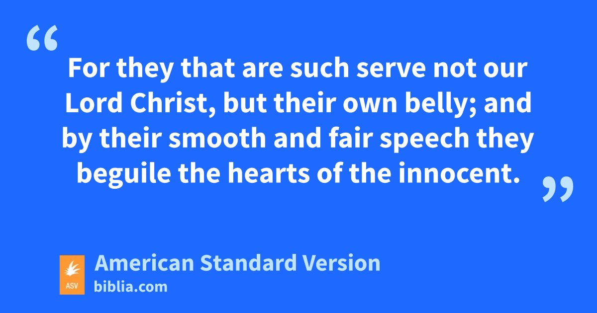 17Now I beseech you, brethren, mark them that are causing the divisions and occasions of stumbling, contrary to the doctrine which ye learned: and turn away from them. 18For they that are such serve not our Lord Christ, but their own belly; and by their smooth and fair speech they beguile the hearts of the innocent. 19For your obedience is come abroad unto all men. I rejoice therefore over you: but I would have you wise unto that which is good, and simple unto that which is evil. 20And the God of peace shall bruise Satan under your feet shortly. The grace of our Lord Jesus Christ be with you.