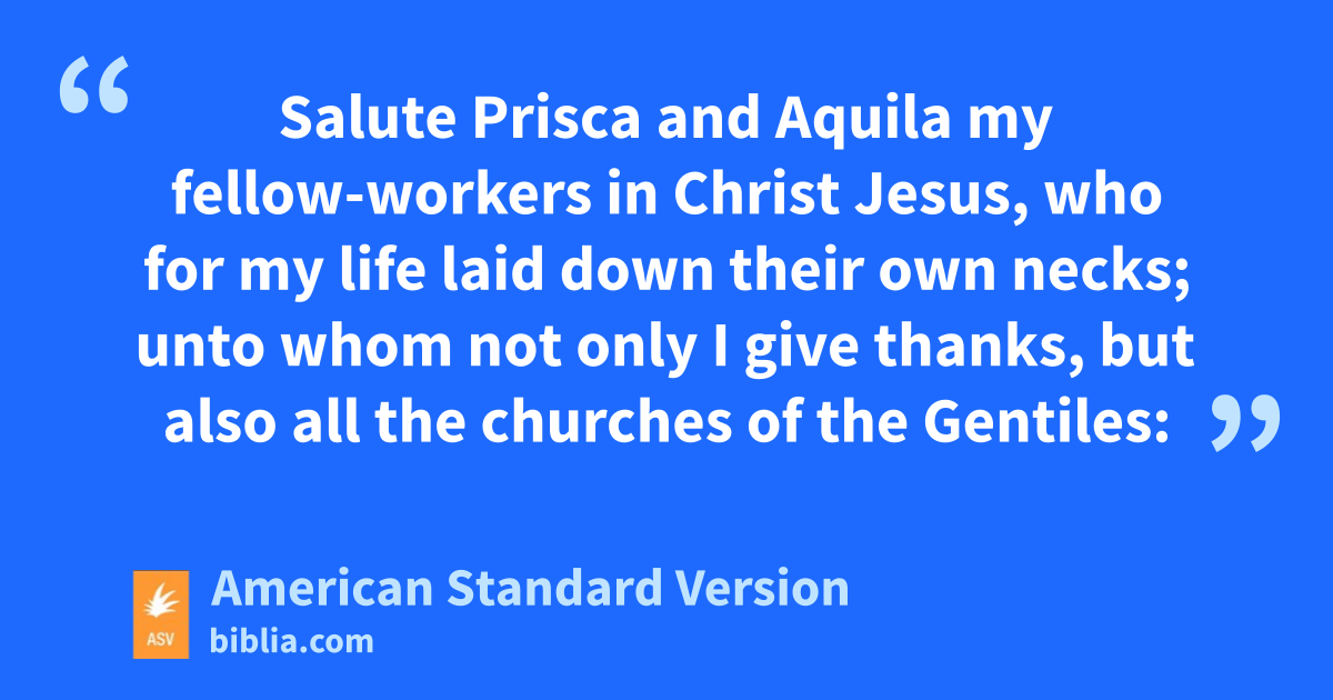 3Salute Prisca and Aquila my fellow-workers in Christ Jesus, 4who for my life laid down their own necks; unto whom not only I give thanks, but also all the churches of the Gentiles: 5and salute the church that is in their house. Salute Epaenetus my beloved, who is the first-fruits of Asia unto Christ. 6Salute Mary, who bestowed much labor on you. 7Salute Andronicus and Junias, my kinsmen, and my fellow-prisoners, who are of note among the apostles, who also have been in Christ before me. 8Salute Ampliatus my beloved in the Lord. 9Salute Urbanus our fellow-worker in Christ, and Stachys my beloved. 10Salute Apelles the approved in Christ. Salute them that are of the household of Aristobulus. 11Salute Herodion my kinsman. Salute them of the household of Narcissus, that are in the Lord. 12Salute Tryphaena and Tryphosa, who labor in the Lord. Salute Persis the beloved, who labored much in the Lord. 13Salute Rufus the chosen in the Lord, and his mother and mine. 14Salute Asyncritus, Phlegon, Hermes, Patrobas, Hermas, and the brethren that are with them. 15Salute Philologus and Julia, Nereus and his sister, and Olympas, and all the saints that are with them. 16Salute one another with a holy kiss. All the churches of Christ salute you.