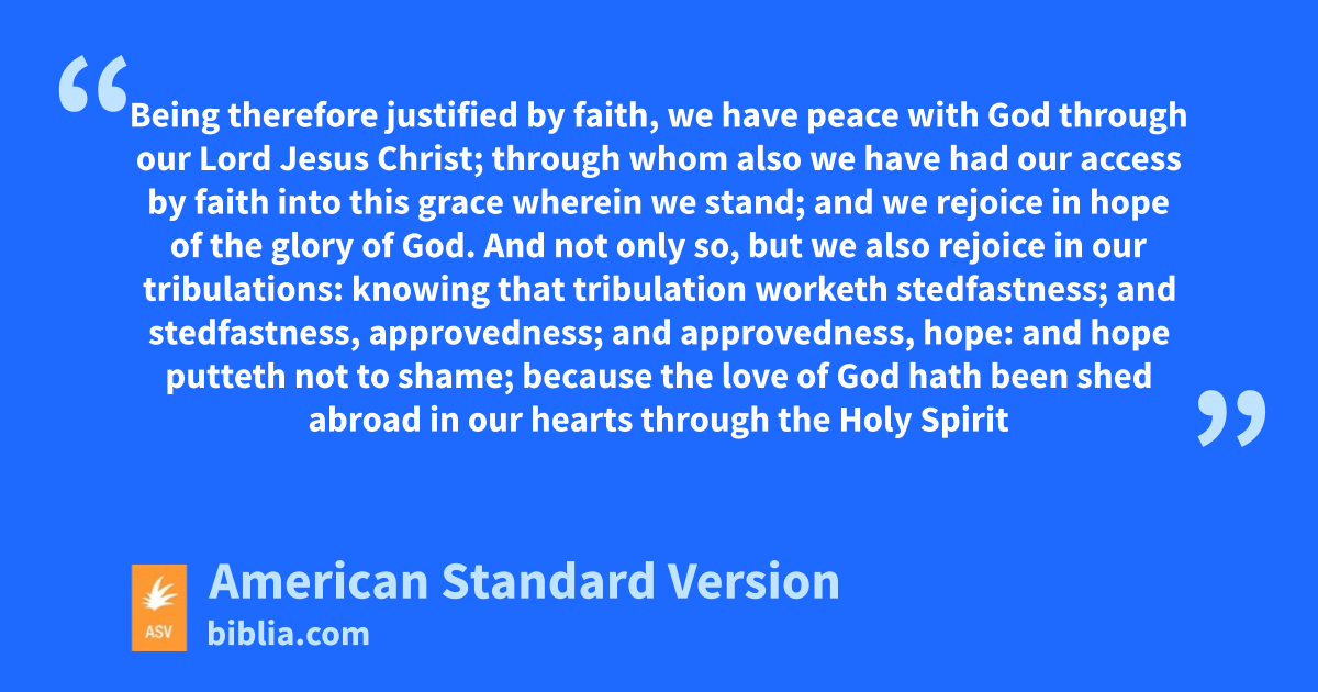 5 Being therefore justified by faith, we have peace with God through our Lord Jesus Christ; 2through whom also we have had our access by faith into this grace wherein we stand; and we rejoice in hope of the glory of God. 3And not only so, but we also rejoice in our tribulations: knowing that tribulation worketh stedfastness; 4and stedfastness, approvedness; and approvedness, hope: 5and hope putteth not to shame; because the love of God hath been shed abroad in our hearts through the Holy Spirit which was given unto us. 6For while we were yet weak, in due season Christ died for the ungodly. 7For scarcely for a righteous man will one die: for peradventure for the good man some one would even dare to die. 8But God commendeth his own love toward us, in that, while we were yet sinners, Christ died for us. 9Much more then, being now justified by his blood, shall we be saved from the wrath of God through him. 10For if, while we were enemies, we were reconciled to God through the death of his Son, much more, being reconciled, shall we be saved by his life; 11and not only so, but we also rejoice in God through our Lord Jesus Christ, through whom we have now received the reconciliation.