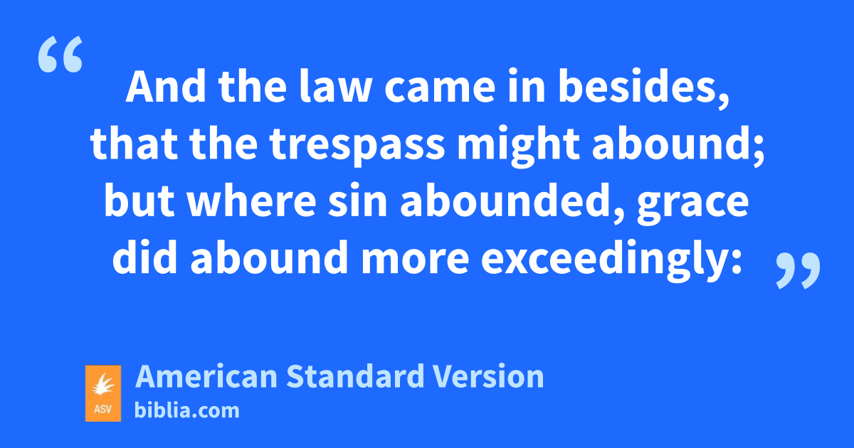 12Therefore, as through one man sin entered into the world, and death through sin; and so death passed unto all men, for that all sinned:— 13for until the law sin was in the world; but sin is not imputed when there is no law. 14Nevertheless death reigned from Adam until Moses, even over them that had not sinned after the likeness of Adam’s transgression, who is a figure of him that was to come. 15But not as the trespass, so also is the free gift. For if by the trespass of the one the many died, much more did the grace of God, and the gift by the grace of the one man, Jesus Christ, abound unto the many. 16And not as through one that sinned, so is the gift: for the judgment came of one unto condemnation, but the free gift came of many trespasses unto justification. 17For if, by the trespass of the one, death reigned through the one; much more shall they that receive the abundance of grace and of the gift of righteousness reign in life through the one, even Jesus Christ. 18So then as through one trespass the judgment came unto all men to condemnation; even so through one act of righteousness the free gift came unto all men to justification of life. 19For as through the one man’s disobedience the many were made sinners, even so through the obedience of the one shall the many be made righteous. 20And the law came in besides, that the trespass might abound; but where sin abounded, grace did abound more exceedingly: 21that, as sin reigned in death, even so might grace reign through righteousness unto eternal life through Jesus Christ our Lord.