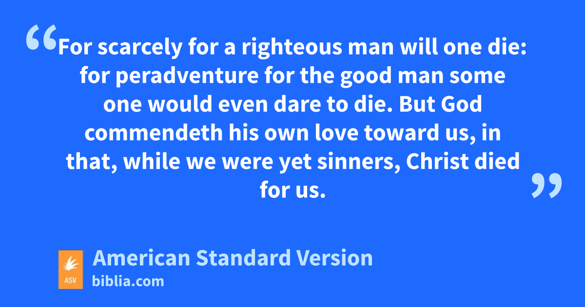 5 Being therefore justified by faith, we have peace with God through our Lord Jesus Christ; 2through whom also we have had our access by faith into this grace wherein we stand; and we rejoice in hope of the glory of God. 3And not only so, but we also rejoice in our tribulations: knowing that tribulation worketh stedfastness; 4and stedfastness, approvedness; and approvedness, hope: 5and hope putteth not to shame; because the love of God hath been shed abroad in our hearts through the Holy Spirit which was given unto us. 6For while we were yet weak, in due season Christ died for the ungodly. 7For scarcely for a righteous man will one die: for peradventure for the good man some one would even dare to die. 8But God commendeth his own love toward us, in that, while we were yet sinners, Christ died for us. 9Much more then, being now justified by his blood, shall we be saved from the wrath of God through him. 10For if, while we were enemies, we were reconciled to God through the death of his Son, much more, being reconciled, shall we be saved by his life; 11and not only so, but we also rejoice in God through our Lord Jesus Christ, through whom we have now received the reconciliation.