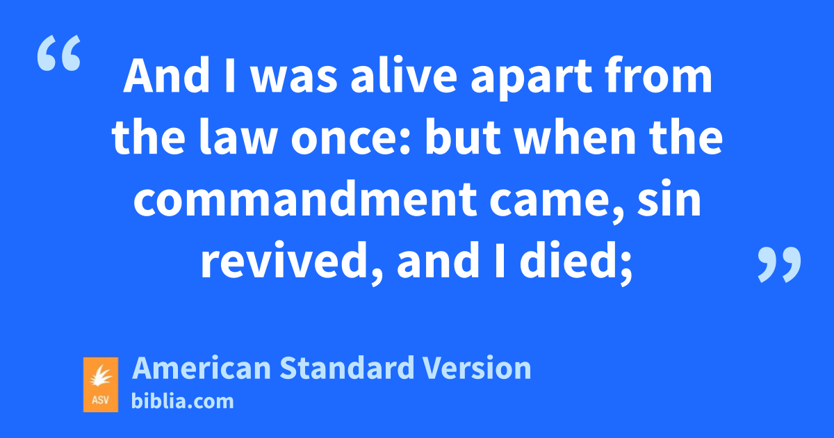 7What shall we say then? Is the law sin? God forbid. Howbeit, I had not known sin, except through the law: for I had not known coveting, except the law had said, Thou shalt not covet: 8but sin, finding occasion, wrought in me through the commandment all manner of coveting: for apart from the law sin is dead. 9And I was alive apart from the law once: but when the commandment came, sin revived, and I died; 10and the commandment, which was unto life, this I found to be unto death: 11for sin, finding occasion, through the commandment beguiled me, and through it slew me. 12So that the law is holy, and the commandment holy, and righteous, and good. 13Did then that which is good become death unto me? God forbid. But sin, that it might be shown to be sin, by working death to me through that which is good;—that through the commandment sin might become exceeding sinful. 14For we know that the law is spiritual: but I am carnal, sold under sin. 15For that which I do I know not: for not what I would, that do I practise; but what I hate, that I do. 16But if what I would not, that I do, I consent unto the law that it is good. 17So now it is no more I that do it, but sin which dwelleth in me. 18For I know that in me, that is, in my flesh, dwelleth no good thing: for to will is present with me, but to do that which is good is not. 19For the good which I would I do not: but the evil which I would not, that I practise. 20But if what I would not, that I do, it is no more I that do it, but sin which dwelleth in me. 21I find then the law, that, to me who would do good, evil is present. 22For I delight in the law of God after the inward man: 23but I see a different law in my members, warring against the law of my mind, and bringing me into captivity under the law of sin which is in my members. 24Wretched man that I am! who shall deliver me out of the body of this death? 25I thank God through Jesus Christ our Lord. So then I of myself with the mind, indeed, serve the law of God; but with the flesh the law of sin.